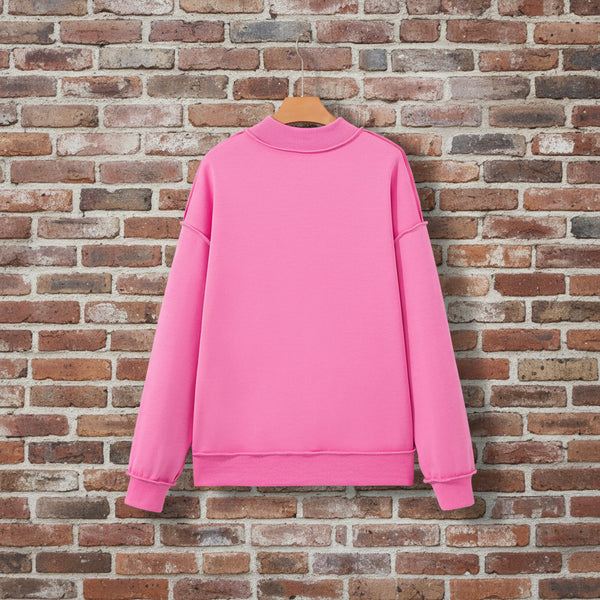 Trendy pink oversized long sleeve soft fleece mock neck sweatshirt with SWEET seaming that makes it 100% REVERSIBLE! . 65%Polyester+35%Cotton.